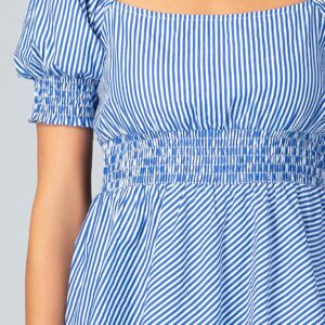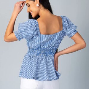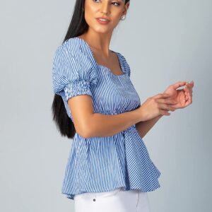 Rhysley Blue Stripes Cotton Square Neck Cuff Short Sleeve Smoked Waist Peplum Top